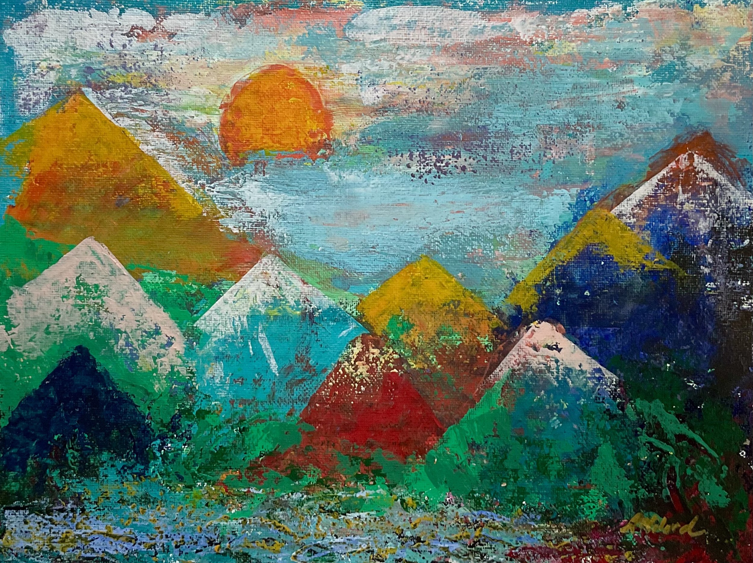 Rainbow Peaks. Acrylic on canvas sheet - 9x12 inches. This piece is inspired by the vibrant beauty of tropical mountains, where color and light dance across the landscape in perfect harmony. Also available in print.