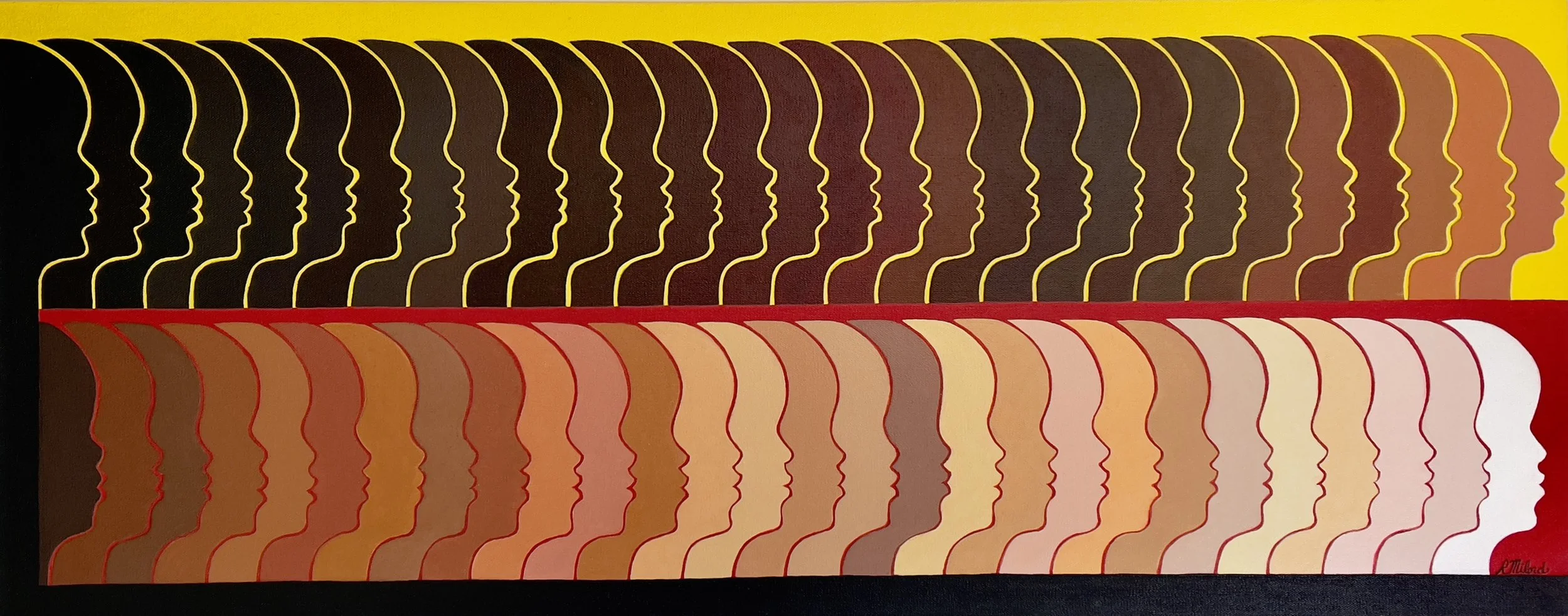 Shades of Humanity. This artwork is a tribute to the beauty of diversity — one human race, many expressions. Acrylic on canvas. 16x36 inches.